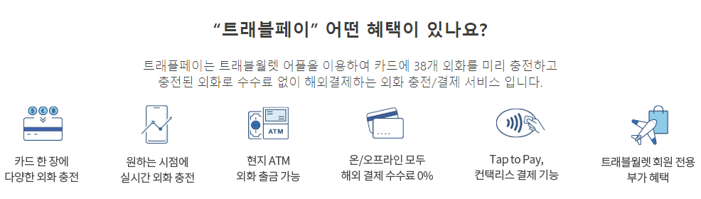 : 과거에 해외여행 갈 때면 얼마를 환전해야 되고 얼마를 들고 다녀야 하는 고민이 전혀 필요 없음. 다량의 현금을 가지고 다니다 보면 분실 걱정이 많았는데 분실 걱정도 할 필요가 없습니다.