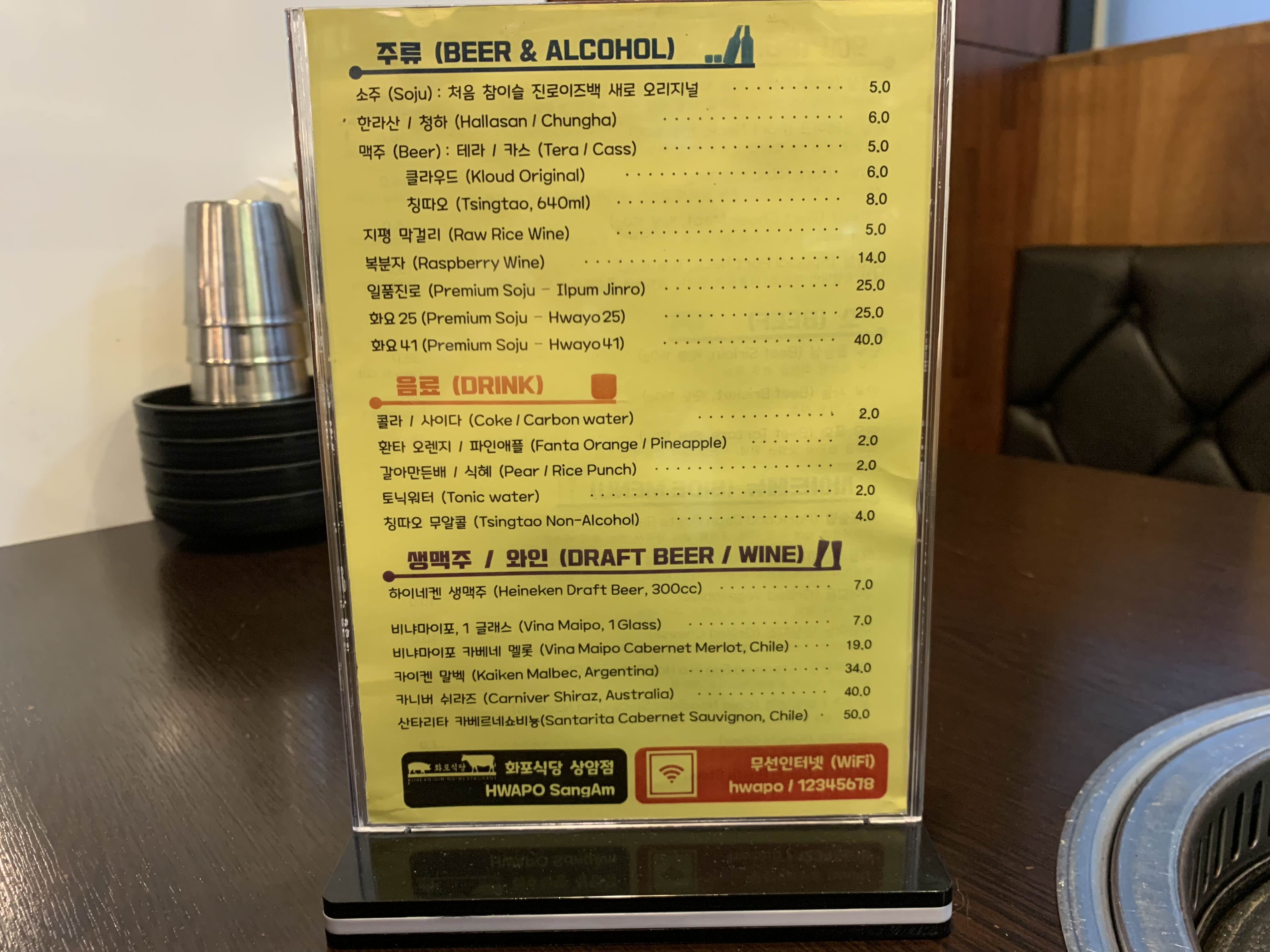 뒷면에는 주류, 음료, 생맥주