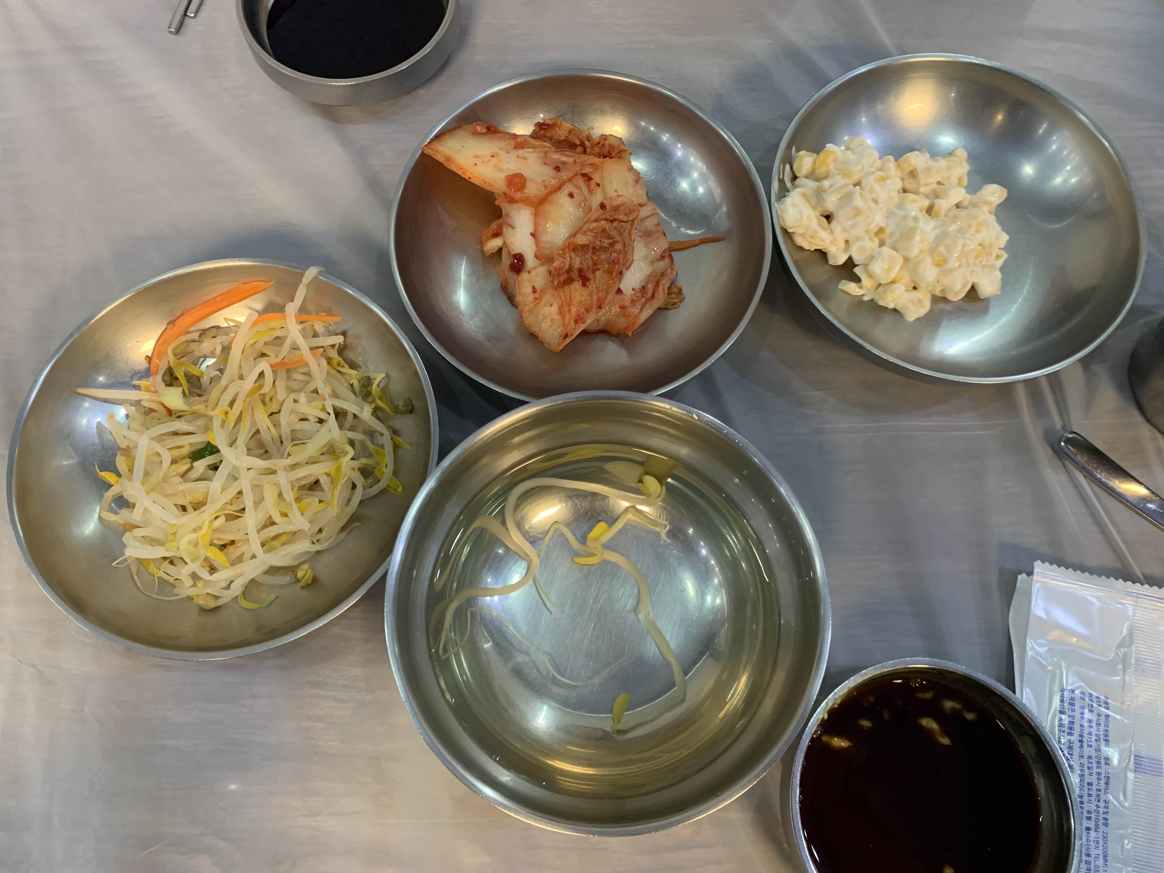 숙주무침, 김치, 콘샐러드 3개와